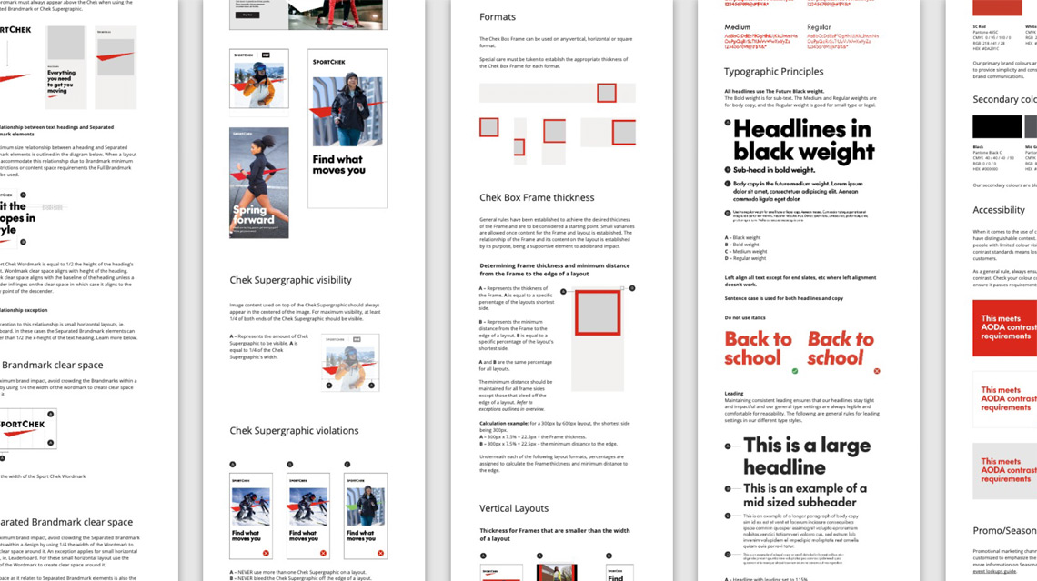 Our process included extensive stakeholder interviews across the organization to understand what was working and what needed improvement with the current brand system. Various territories were explored and ultimately the chosen direction strongly connected back to the goal of positioning the retailer as Canada’s destination for sport. Following the development of bold, dynamic foundational elements including logo, typeface, colour, tagline and graphic elements, my team worked to blow out full, detailed guidelines for each channel.