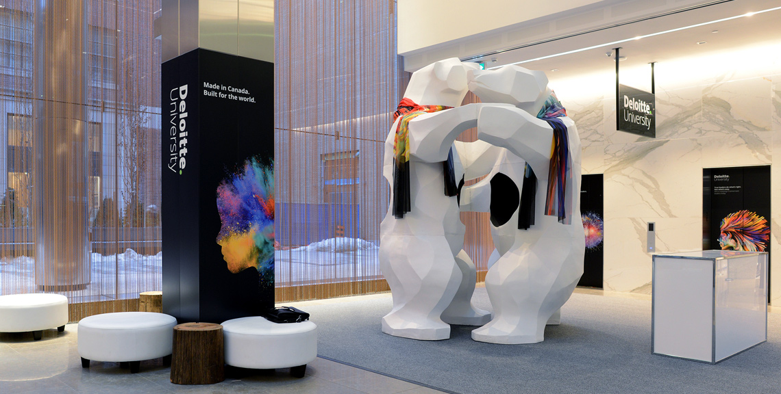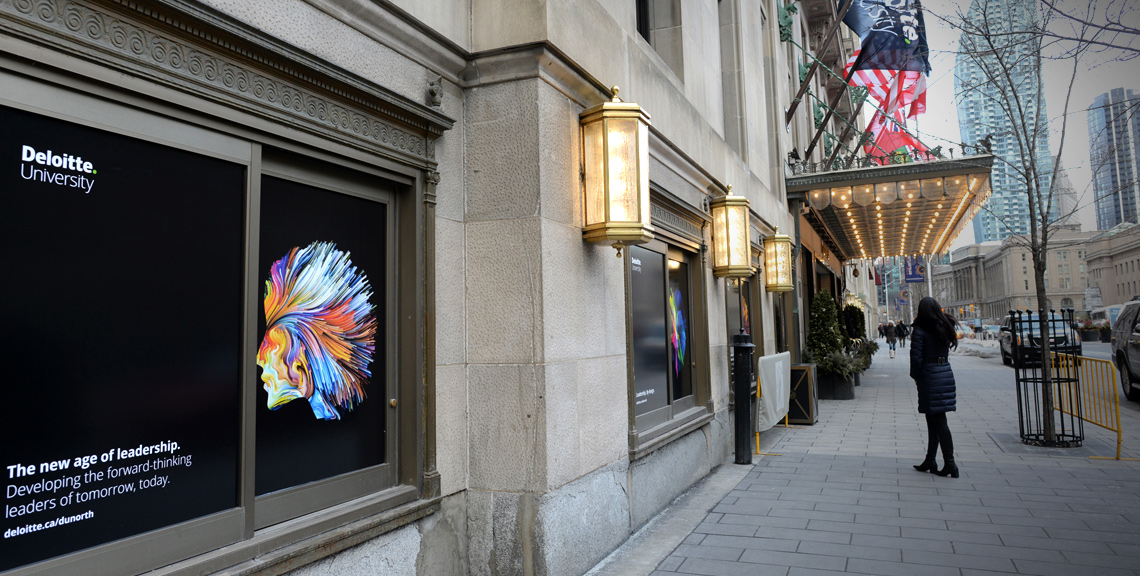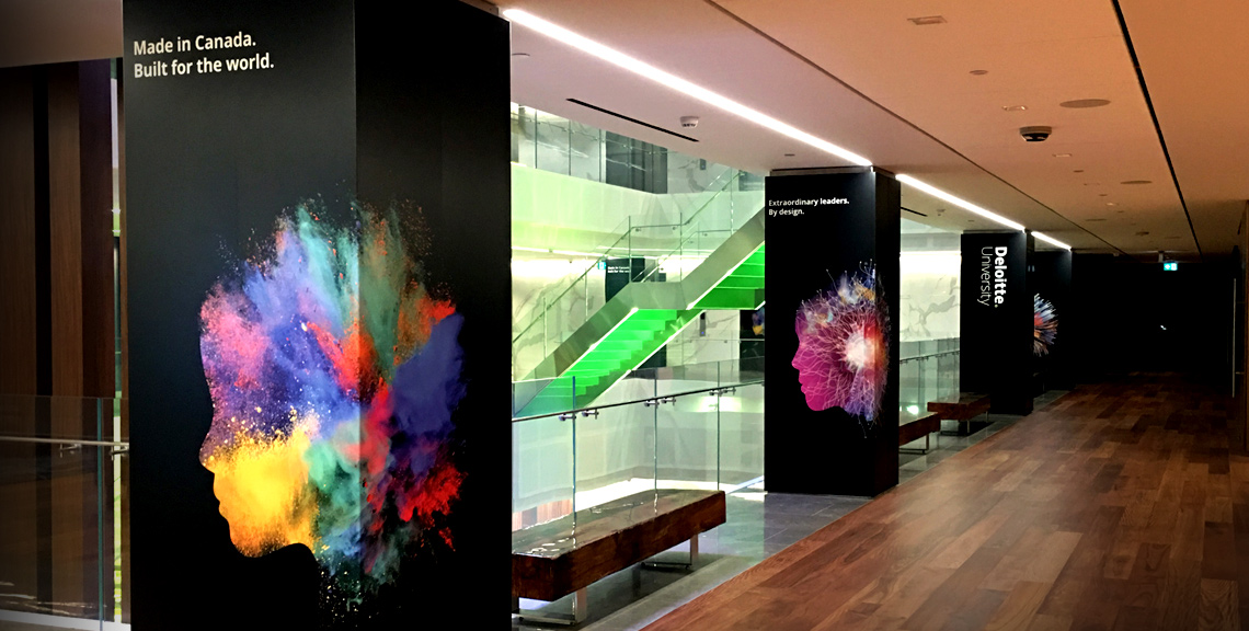 For the launch of this innovative new offering, my team was tasked to develop creative for a campaign including advertising placements in the Toronto PATH system and the Royal York Hotel, as well as a captivation in our new office space. Through my creative briefing process I learned this new offering is turning learning convention on its head. The learning is done in a classroom, not online. The curriculum is not outsourced, but developed by the firm’s own partners. The learning isn’t technical, rather it is aimed at developing the next generation of leaders. In addition, it is not a learning centre, incubator, school or conference centre. The only description that leaders were comfortable with was to describe it as a transformative experience. I channelled the ideas of experience and transformation to inform the direction of the creative, where silhouettes are exploding with colours, shapes and synapses. The images aim to serve as a visual representation of the growth and change attendees experience.